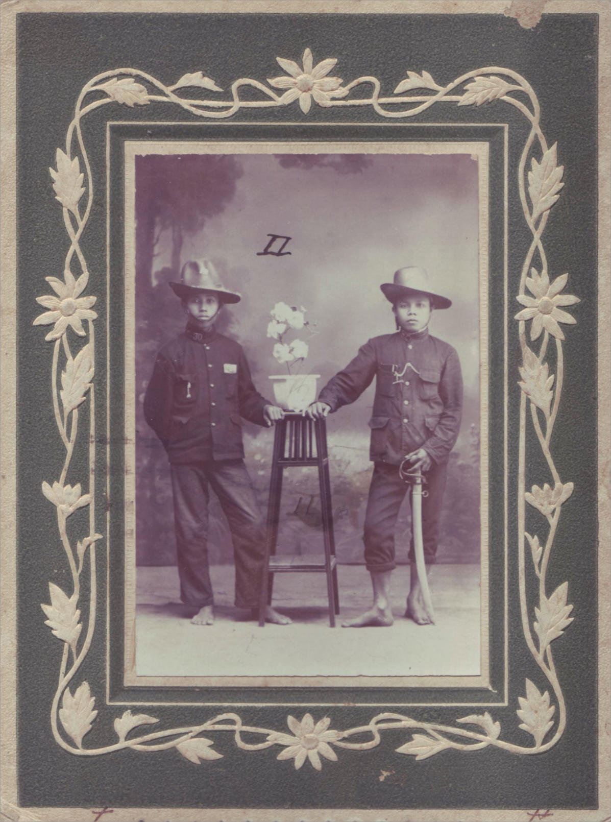 Description: Mounted photograph depicting two